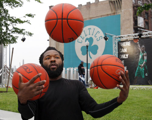Rashaun Daniels juggles basketballs outside the TD Banknorth Garden ahead of Game 1 of the NBA Finals basketball championship between the Boston Celtics and the Los Angeles Lakers in Boston, June 5, 2008. [Agencies]