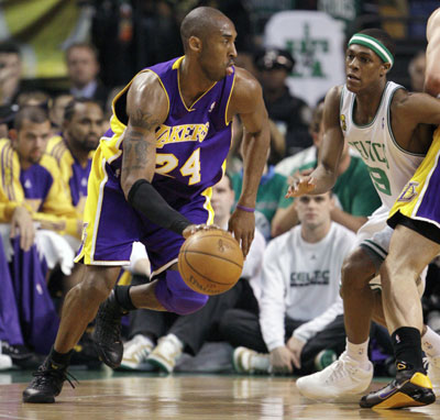 Los Angeles Lakers Kobe Bryant is guarded by Boston Celtics Rajon Rondo (R) during the first half of Game 1 of the NBA Finals basketball championship in Boston, June 5, 2008. [Agencies]