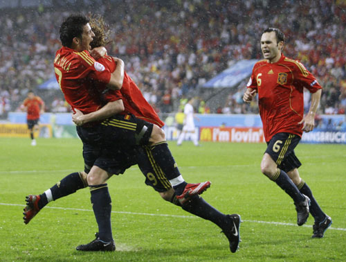 Spain's David Villa (L) celebrates his goal with team mate Fernando Torres (C) as Spain's Andres Iniesta runs towards them during their Group D Euro 2008 soccer match against Russia at the Ti voli Neu Stadium in Innsbruck, June 10, 2008. [Agencies]