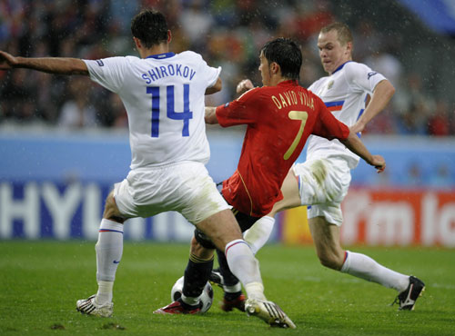 Spain's David Villa (C) shoots to score between Russia's Roman Shirokov (L) and Alexander Anyukov during their Group D Euro 2008 soccer match at the Tivoli Neu Stadium in Innsbruck, June 10, 2008. [Agencies]
