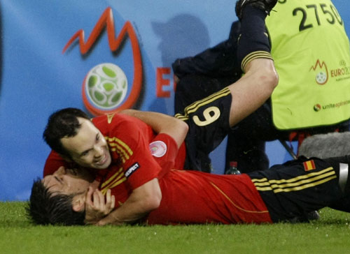 Spain's David Villa (lower) celebrates his second goal with team mate Andres Iniesta during their Group D Euro 2008 soccer match against Russia at the Ti voli Neu Stadium in Innsbruck, June 10, 2008. [Agencies]
