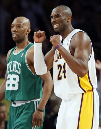 Los Angeles Lakers guard Kobe Bryant (R) celebrates in front of Boston Celtics guard Sam Cassell in the fourth quarter during Game 5 of the NBA Finals basketball championship in Los Angeles, June 15, 2008. [Agencies]