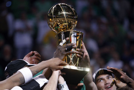 Members of the Boston Celtics hold the Larry O'Brien Trophy after their team defeated the Los Angeles Lakers in Game 6 to win the NBA Finals basketball championship in Boston, June 17, 2008. [Agencies]