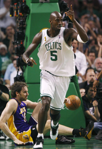 Boston Celtics Kevin Garnett celebrates a basket in front of Los Angeles Lakers Pau Gasol (back) during the first half in Game 6 of the NBA Finals basketball championship in Boston, June 17, 2008. [Agencies]