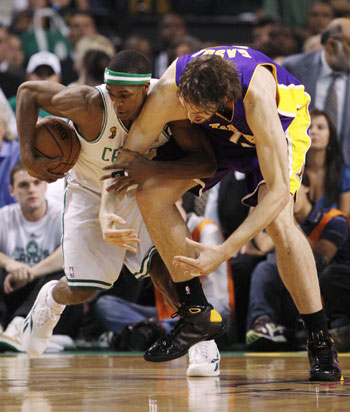 Boston Celtics Rajon Rondo battles for the ball with Los Angeles Lakers Pau Gasol (R) during the first half in Game 6 of the NBA Finals basketball championship in Boston, June 17, 2008. [Agencies]