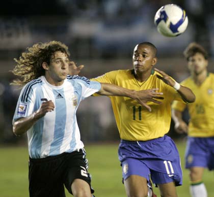 Argentina's Fabricio Coloccini (L) and Brazil's Robinho run for the ball during their World Cup qualifying match in Minerao stadium in Belo Horizonte June 18, 2008. [Agencies]