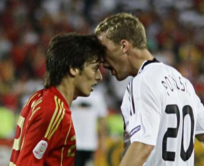 Spain's David Silva (L) clashes with Germany's Lukas Podolski during their Euro 2008 final soccer match at Ernst Happel Stadium in Vienna, June 29, 2008. [Agencies]