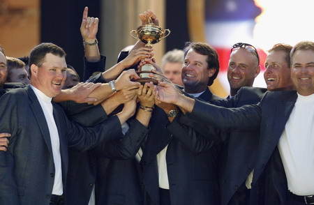 Members of the US Ryder Cup team celebrate with the cup during closing ceremonies after the US team defeated the European team to win the 37th Ryder Cup Championship at the Valhalla Golf Club in Louisville, Kentucky September 21, 2008. From left are Chad Campbell, team captain Paul Azinger, Stewart Cink, Phil Mickelson and Kenny Perry. [Agencies]