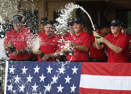 US Ryder Cup players (L-R) Kenny Perry, J.B. Holmes, Boo Weekley and Hunter Mahan celebrate with champagne after they defeated the European team to win the 37th Ryder Cup Championship at the Valhalla Golf Club in Louisville, Kentucky September 21, 2008. [Agencies]
