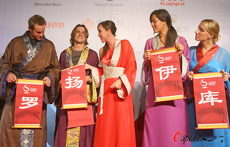 Tennis stars Andy Roddick of the United States, David Ferrer of Spain, Jelena Jankovic and Ana Ivanovic of Serbia, and Svetlana Kuznetsova of Russia (from L to R), dressed up in Chinese-style robes from the Han dynasty (221 BC-AD 220) and share a joke during the official reception of the 2008 China Open at the Shangri-La Hotel, September 23, 2008, Beijing, China. [Osports.com]