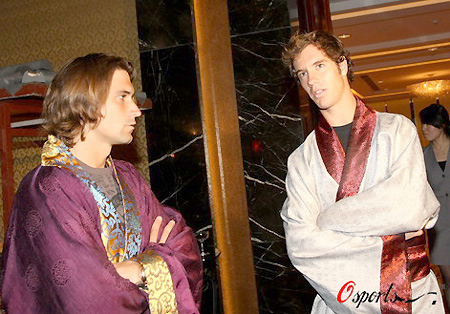 Tennis stars David Ferrer of Spain (L) and Richard Gasquet of France, are dressed in Chinese-style robes from the Han dynasty (221 BC-AD 220) for the official reception of the 2008 China Open at the Shangri-La Hotel on September 23, 2008 in Beijing, China. [Osports.com]