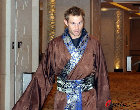 American tennis star Andy Roddick, dressed in Chinese-style robes from the Han dynasty (221 BC-AD 220), attends the official reception of the 2008 China Open at the Shangri-La Hotel on September 23, 2008 in Beijing, China. [Osports.com]