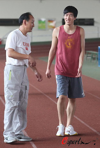 China's world 110m hurdles champion Liu Xiang speaks with his coach at a traning session in Xinzhuang, Shanghai, September 24, 2008. It's Liu's 1st public training session since he pulled out of the preliminaries at the Beijing Games due to an inflammation in his Achilles' tendon. [Osports]