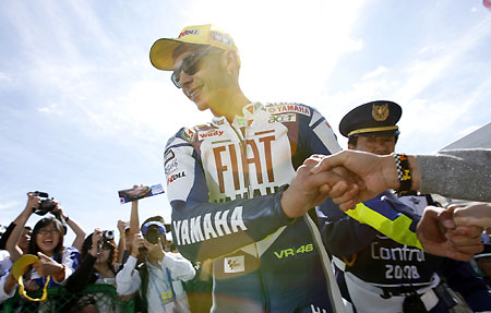 Yamaha MotoGP rider Valentino Rossi of Italy shakes hands with fans after a free practice session for the Japanese Grand Prix in Motegi, north of Tokyo September 27, 2008.[Agencies]