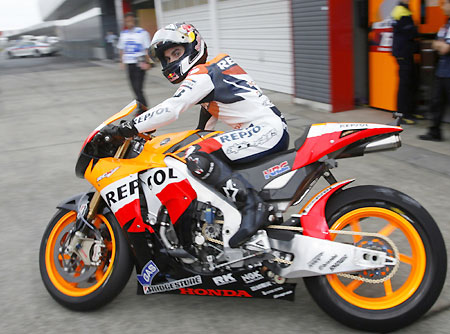 Honda MotoGP rider Dani Pedrosa of Spain makes his way from his pit during a free practice session for the Japanese Grand Prix in Motegi, north of Tokyo September 26, 2008. [Agencies]