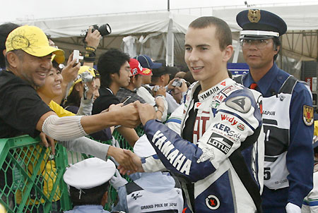 Yamaha MotoGP rider Jorge Lorenzo of Spain shakes hands with fans after a free practice session for the Japanese Grand Prix in Motegi, north of Tokyo September 26, 2008. [Agencies]
