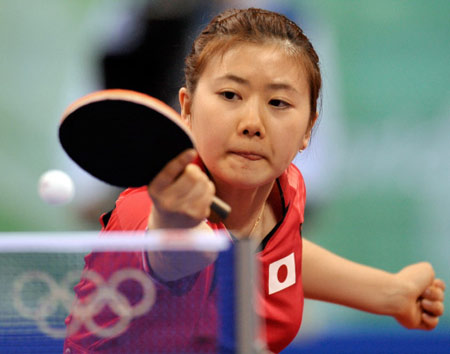 Japan's Ai Fukuhara plays against China's Zhang Yining in their women's singles table tennis preliminary round match in this August 21, 2008 file photo. Ai Fukuhara will do as Chinese Olympic veteran Wang Nan's bridesmaid. [sina.com]