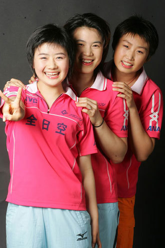 Japan's Ai Fukuhara poses for a photo with Chinese Olympic table tennis champions Wang Nan and Guo Yue in this file photo undated. Ai Fukuhara will do as Wang Nan's bridesmaid. [sina.com]
