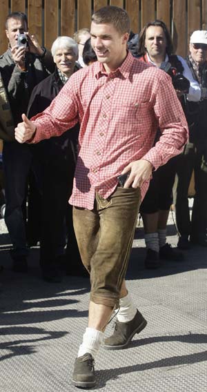 Updated: 2008-10-05 22:15 ![]() Bayern Munich's Lukas Podolski arrives for a visit at the world biggest beer festival, the Oktoberfest in Munich October 5, 2008. Millions of beer drinkers from around the world come to the Bavarian capital Munich for the world's biggest and most famous beer festival, the Oktoberfest which lasts till October 5. [Agencies]