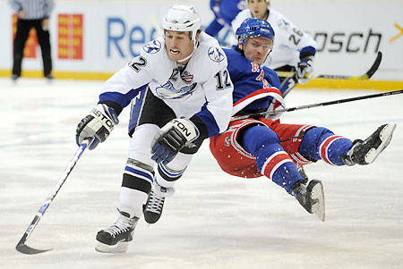 Updated: 2008-10-06 09:48 PRAGUE: The New York Rangers defeated the Tampa Bay Lightning 2-1 thanks to a late powerplay goal to get the season underway in the Czech capital on Saturday.