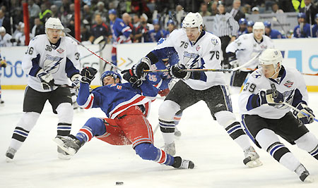 New York Rangers' Ryan Callahan is tackled by Tampa Bay Lighting's Evgeny Artykhin during the second period of their NHL hockey game in Prague October 5, 2008. [Agencies]