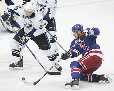 New York Rangers' Chris Drury (R) battles for the puck with Tampa Bay Lightning's Mike Lundin during their NHL hockey game in Prague October 5, 2008. [Agencies]