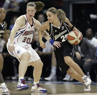 San Antonio Silver Stars guard Becky Hammon (R) drives against Detroit Shock forward Katie Smith during the second half of Game 3 WNBA basketball finals in Yipsilanti, Michigan October 5, 2008. [Agencies]