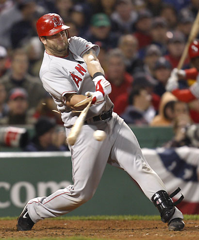 Los Angeles Angels' Mike Napoli breaks his bat as he grounds out to end the ninth inning against the Boston Red Sox during Game 3 of their MLB American League Division Series baseball playoff at Fenway Park in Boston, Massachusetts, October 5, 2008. [Agencies]