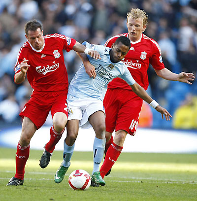 Manchester City's Robinho (C) is challenged by Liverpool's Jamie Carragher (L) and Dirk Kuyt (R) during their English Premier League soccer match in Manchester, northern England, October 5, 2008. [Agencies]