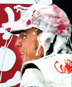 Updated: 2008-10-13 08:59 FUJI, Japan: Renault's Fernando Alonso stormed to his second win in a row at a wild Japanese Grand Prix on Sunday, while McLaren's championship leader Lewis Hamilton plunged from first to last and failed to score. Hamilton finished in 12th after starting on pole, with Ferrari's Felipe Massa battling to eighth - later promoted to seventh - to close the gap on the Briton to five points with two races left. The Formula One title rivals both received drive-through penalties, Hamilton for cutting across Kimi Raikkonen's Ferrari and causing mayhem behind him in a mad dash to the first corner.
