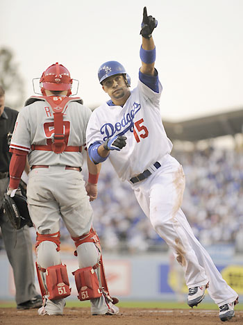 Los Angeles Dodgers' Rafael Furcal reacts in front of Philadelphia Phillies catcher after hitting a solo home run in the second inning in Game 3 of Major League Baseball's NLCS playoff series in Los Angeles October 12, 2008. [Agencies]