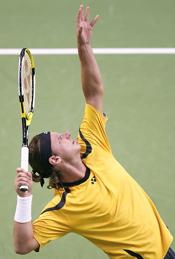 David Nalbandian of Argentina serves the ball to Robin Soderling of Sweden during the finals of the ATP Stockholm Open tennis tournament in Stockholm October 12, 2008. [Agencies]