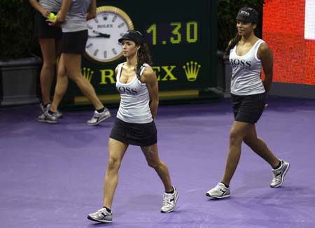 Models, who have replaced the traditional ball boys at the Masters Series Madrid tournament, arrive at the match between Rafael Nadal of Spain and Ernests Gulbis of Latvia in Madrid October 14, 2008.[Agencies]