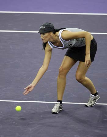One of the models, who have replaced the traditional ball boys at the Masters Series Madrid tournament, throws a ball during the match between Rafael Nadal of Spain and Ernests Gulbis of Latvia in Madrid October 14, 2008.[Agencies]