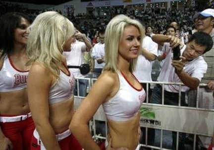 A fan takes a picture of cheerleaders before a basketball exhibition game between NBA's Golden State Warriors and Milwaukee Bucks at Guangzhou Gymnasium in Guangzhou, southern city of China Wednesday, Oct. 15, 2008. [Agencies]