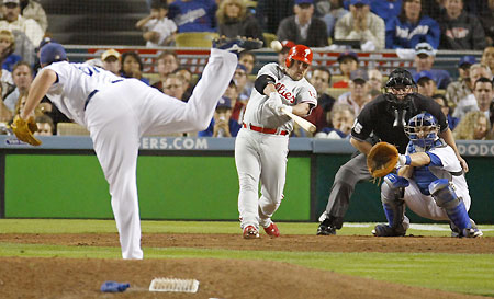 Philadelphia Phillies' Matt Stairs hits a two-run home run against Los Angeles Dodgers pitcher Jonathan Braxton (L) in the eighth inning in Game 4 of Major League Baseball's NLCS playoff series in Los Angeles, October 13, 2008. [Agencies]