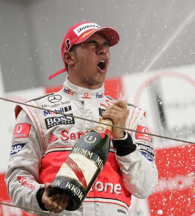 McLaren Formula One driver Lewis Hamilton of Britain celebrates after winning the Chinese F1 Grand Prix in Shanghai October 19, 2008.[Agencies]
