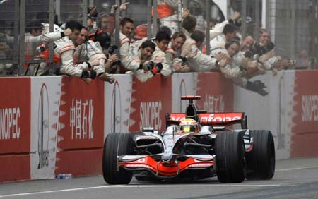 McLaren pit crew and team members celebrate as their Formula One driver Lewis Hamilton of Britain wins the Chinese F1 Grand Prix in Shanghai October 19, 2008.[Agencies]