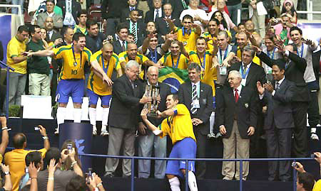 The president of the Brazilian Confederation of Soccer, Ricardo Teixeira (front row, 1st L), presents the trophy to Vinicius (C, front row), the captain of the team of Brazil, after the final of 2008 FIFA Futsal World Cup between Brazil and Spain in Rio De Janeiro, Brazil, on Oct. 19, 2008. [Xinhua]