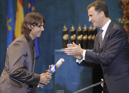 Rafa Nadal (L) receives the 2008 Prince of Asturias Award for Sports from Spain's Crown Prince Felipe during a ceremony at Campoamor theatre in Oviedo, northern Spain, October 24, 2008. [Agencies]