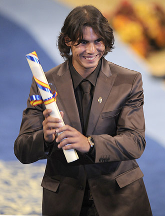 Rafael Nadal acknowledges the crowd after receiving the 2008 Prince of Asturias Award for Sports from Spain's Crown Prince Felipe during a ceremony at Campoamor theatre in Oviedo, northern Spain, October 24, 2008. [Agencies]