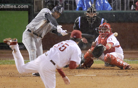 Tampa Bay Rays Carlos Pena (L) hits an RBI single off Philadelphia Phillies pitcher Cole Hamels (C) in front of catcher Carlos Ruiz (R) during the sixth inning in Game 5 of Major League Baseball's World Series in Philadelphia, October 27, 2008. [Agencies]