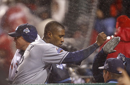 Tampa Bay Rays' B.J. Upton is congratulated by teammates after scoring in the sixth inning against the Philadelphia Phillies in Game 5 of Major League Baseball's World Series in Philadelphia, October 27, 2008. [Agencies]