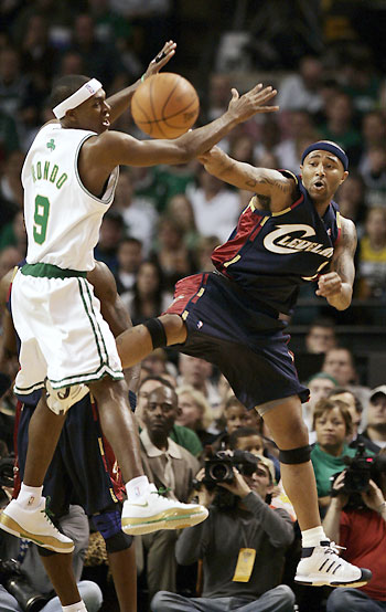 Cleveland Cavaliers guard Mo Williams passes around Boston Celtics guard Rajon Rondo in second quarter action during their NBA basketball game in Boston, Massachusetts October 28, 2008. [Agencies]