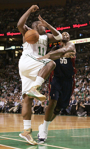 Boston Celtics forward Glen Davis has the ball knocked away by Cleveland Cavaliers forward Lorenzen Wright in second quarter action during their NBA basketball game in Boston, Massachusetts October 28, 2008. [Agencies]