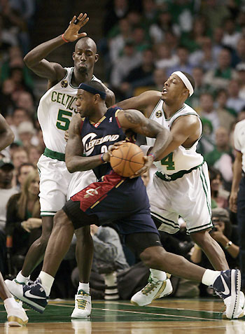 Cleveland Cavaliers forward LeBron James (C) drives the lane being defended by Boston Celtics forward Kevin Garnett (L) and forward Paul Pierce in second quarter action during their NBA Basketball game in Boston, Massachusetts October 28, 2008. [Agencies]