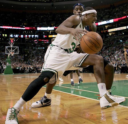 Boston Celtics forward Paul Pierce drives to the hoop being defended by Cleveland Cavaliers forward LeBron James in first quarter action during their NBA Basketball game in Boston, Massachusetts October 28, 2008. [Agencies]
