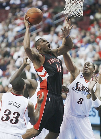 Toronto Raptors Joey Graham goes to the basket against Philadelphia 76ers Donyell Marshall (8) and Willie Green (33) during the first quarter of NBA basketball action in Philadelphia, October 29, 2008. [Agencies]