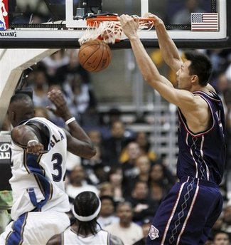 Two days after celebrating his 21st birthday, the 7-footer from Shenzhen was formidable defensively as well as with the ball to emerge a winner in his first game with the Nets after being traded from Milwaukee last June. "It felt great," Yi said. "We got off to a great start by winning our first game. Our whole team played well, worked hard, showing patience, shot the ball well. In the second half we rebounded well and played great defense." Vince Carter scored a game-high 21 points and Yi contributed a team-high six rebounds as well as energy and accurate outside shooting to spark the Nets, who blew open a tight game with a 13-5 run over the final five minutes. "He has a lot of energy and that's what we need," Carter said. "He was able to get up and down the court well, rebound well and played defense. We showed a lot of poise." Yi, who has played for China in the past two Olympics, was in the locker room barely an hour before tip-off staring intently at a laptop computer with teammates and assistant coaches going over defensive schemes for the game. The work paid off. A Yi 3-pointer ignited a 10-2 run to give the Nets their biggest lead until the last seconds at 58-52 just 4:57 into the second half on a 3-point play by Carter, who was fouled in mid-leap but made a spectacular reverse layup. New Jersey led 69-67 entering the fourth quarter and the game remained tense to the end, Yi making his best move with a steal that he turned into a fast break slam dunk with 7:46 to play, putting the Nets ahead 78-75. New Jersey's defense took command from there. The Wizards made only one basket from the field in a span of nine minutes in the fourth quarter, Yi grabbing three key rebounds in the fourth quarter to help bury the Wizards. "I expected his best effort and he contributed," Nets coach Lawrence Frank said. "It's good he rebounded. He shot the ball well. Yi had a very good game. He did a very good job. "It's a good first step. Let's just continue to build and go from there." Yi, in many ways still learning about the NBA after being taken sixth in last year's NBA Draft, has bonded well and quickly with his new teammates. "I felt good," Yi said. "I've been working with them for two months so it is coming together." Yi is now on a team that has been rebuilt after missing the playoffs last season for the first time since 2001, going 34-48. "He understands what's going on in practice very well," Frank said. "This is his second year. I think he is farther along." It's not only a learning experience for Yi. Eight of 12 players on the Nets roster were not with the team last season. New Jersey added three draft picks, two free agents and three players by trades. "The big thing is we played well together. We were unselfish. We shared the ball. We all had an opportunity to shoot. I rebounded and shot well, played good defense. We helped each other on the defense." Yi averaged 8.6 points and 5.2 rebounds a game for the Bucks last season. In five pre-season starts for the Nets, Yi averaged 12.8 points and 3.0 rebounds. A sellout crowd of 20,173 watched at an arena in the Chinatown section of the US capital. |