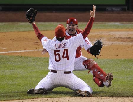 Philadelphia Phillies closer Brad Lidge celebrates with catcher Carlos Ruiz after their team defeated the Tampa Bay Rays to win Major League Baseball's World Series after game 5 in Philadelphia, October 29, 2008.[Agencies]